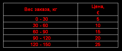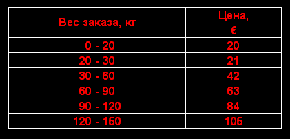 Доставка Ваших покупок осуществляется с помощью транспортной компании PPL. Тарифы едины для любого города страны назначения и не зависят от его удаленности. Стоимость доставки всего заказа рассчитывается по таблице: