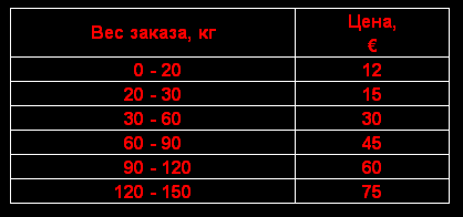 Доставка Ваших покупок осуществляется с помощью чешской почты. Тарифы едины для любого города страны назначения и не зависят от его удаленности. Стоимость доставки всего заказа рассчитывается по таблице: